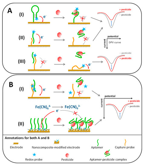 Among various redox probes, ferrocene and methylene blue are frequently used to label the aptamers or capture sequences in electrochemical pesticide aptasensors. Binding of the pesticide target causes conformational changes of the aptamer, which causes the labelled redox probe to separate or approach the electrode surface, which respectively results in reduction or enhancement of the electrical signal, as schematically represented in Figure 6A. Fu et al. developed voltametric aptasensors to determine organophosphates (OPs). Chitosan–graphene oxide nanocomposite was coated on the electrode surface to improve conductivity and participate in ferrocene-labelled aptamer immobilization. Initially, without OPs, the immobilized aptamers underwent hairpin-loop formation and brought the labelled ferrocene in close proximity to the electrode (Figure 6(AI)). The addition of OPs opened up the hairpin loop and hindered the redox signal away from the electrode, which measured profenofos, phorate, isocarbophos and omethoate at LOD of 0.01, 0.1, 0.01 and 0.1 nM, respectively [135].
