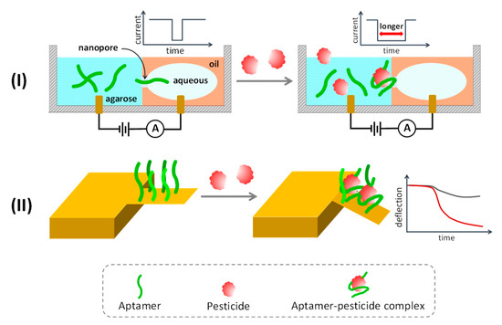 - Fujii, S.; Nobukawa, A.; Osaki, T.; Morimoto, Y.; Kamiya, K.; Misawa, N.; Takeuchi, S. Pesticide vapor sensing using an aptamer, nanopore, and agarose gel on a chip. Lab Chip 2017, 17, 2421–2425. [Google Scholar] [CrossRef] [PubMed]