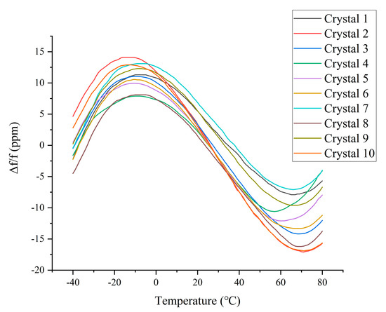 The crystal oscillator used in the TCXO designed for this study is an AT-cut crystal oscillator. The output frequency change curve of this crystal oscillator with temperature is an approximate cubic curve, presenting a lying “S” shape, with two inflection points at about −10 and 65 °C. The frequency stability of the AT-cut quartz crystal oscillator used in this article is 20 ppm, and temperature is the main factor affecting its frequency stability [20]. For comparison, this study used 10 AT-cut crystal oscillators with a nominal frequency of 10 MHz. Their temperature–frequency curves are shown in Figure 1, where f = 10 MHz.