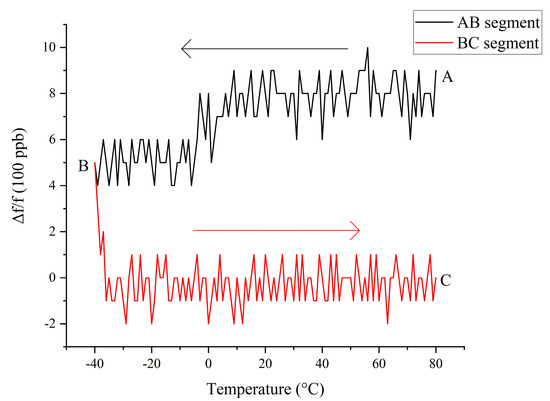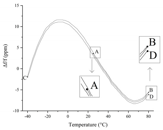 However, the crystal frequency change curve with temperature does not repeat identically when the temperature cycle changes [26]. Figure 2 shows the frequency–temperature curve of crystal 1 in the thermal cycle, where f = 10 MHz. The thermal cycling process of A→B→C→D first rises from 25 to 80 °C (AB segment), then drops from 80 to −40 °C (BC segment), and finally rises from −40 to 80 °C (CD segment). Figure 2 shows that, in this temperature cycle, the BC and CD segments of the crystal oscillator frequency–temperature curve are obviously different. This phenomenon is the thermal hysteresis of the crystal. After multiple measurements under the temperature cycle from −40 to 80 °C, it was found that both the rising and dropping edges of the temperature curve have good repeatability throughout the temperature cycle. The same phenomenon was measured for the other nine crystals