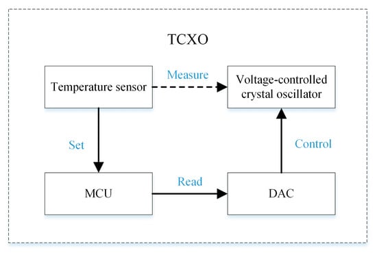 Clock signals are critical in numerous electronic systems, particularly wireless sensor networks and wireless Internet of Things devices that contain multiple sensors [1,2,3,4]. In these systems, multiple devices are often required to coordinate work, which involves clock synchronization between devices [5], and the clock stability of the crystal oscillator in each device is a key factor in determining the synchronization effect [6,7]. However, the frequency stability of general crystal oscillators is not high, and is mainly affected by environmental temperature [8]. Both the TCXO and the oven-controlled X’tal (crystal) oscillator (OCXO) can reduce the influence of crystal working environment temperature on their output frequency. The TCXO maintains the stability of the frequency by compensating the frequency offset of the crystal oscillator caused by temperature changes, whose stability is generally around 1 ppm. The OCXO keeps its output frequency stable by raising the temperature around the oscillator to a predetermined value and maintaining it at a level at which frequency stability of around 1 ppb can be obtained. Although the OCXO has high frequency stability, because of the development of micro-electro-mechanical system technology with characteristics of low cost, low power consumption, integration, and multi-function, the OCXO has fewer applications due to its shortcomings, such as high power consumption and integration difficulties [9]. Because of its low power consumption and easy integration [10], the TCXO has become the mainstream choice for multi-device system clocks. The stability of the TCXO is relatively low and has a significant influence on the synchronization effect. In recent years, research has improved the algorithm to reduce the effect of the TCXO stability on the synchronization effect [11,12,13,14], but the effect is limited. If the frequency stability of the TCXO can be further improved, a better synchronization effect can be obtained. In addition to the higher frequency stability of the TCXO indoor positioning [15], the control of unmanned aerial vehicles (UAVs) [16] and high-precision time measurement [17] show good application potential.