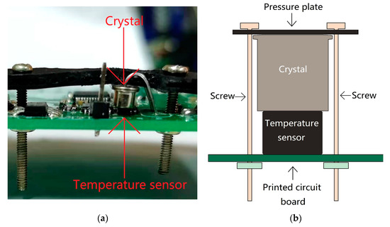 These crystal oscillators were used as clock sources of TCXOs to better demonstrate their thermal hysteresis. The structure diagram of the TCXO designed for this study is shown in Figure 3, and the physical diagram is shown in Figure 4. The pressure plate in the picture enables closer contact between the crystal and the temperature sensor. The methods used to install the crystal and temperature sensor and measure the temperature are described in more detail below.