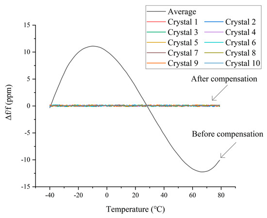The compensation result is shown in Figure 6, where the curve marked “Average” is the average curve of the ten curves in Figure 1. This is to make Figure 6 easier to read. It can be seen from Figure 6 that after temperature compensation the frequency stability of the crystal was significantly improved.