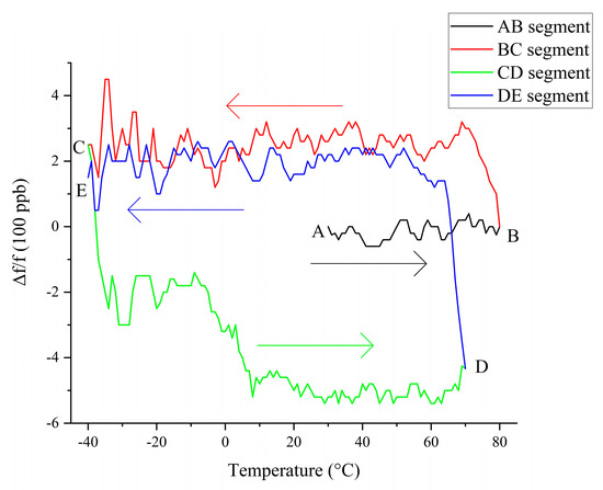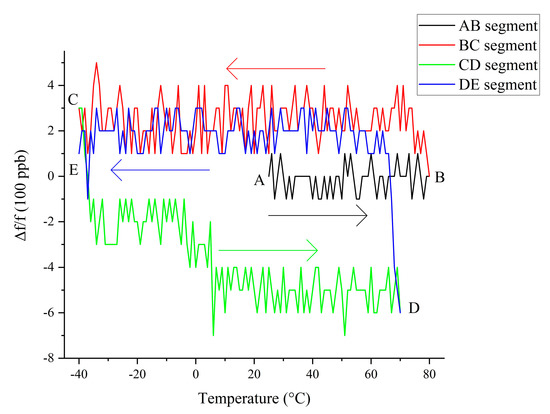 After digital compensation, we conducted a thermal cycling experiment on the TCXO with crystal 1 as the clock source; the temperature cycle test was conducted and the test result is shown in Figure 4. The test process was to first raise the temperature from 25 to 80 °C (AB segment), then drop it from 80 to −40 °C (BC segment), then raise it from −40 to 70 °C (CD segment), and finally drop it from 70 to −40 °C (DE segment).