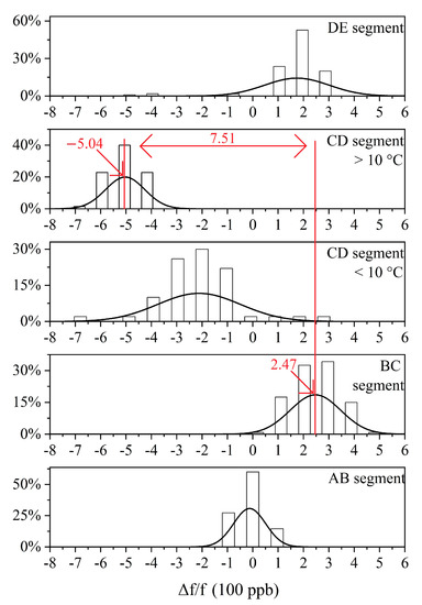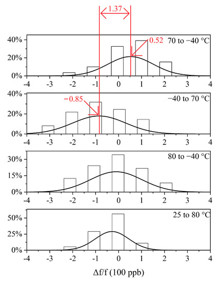 Figure 10 shows the frequency distribution diagram of the curves in Figure 7. Observing Figure 7, it is obvious that the CD segment is divided into two parts, i.e., greater than 10 °C and less than 10 °C. Each part can be approximately regarded as a straight line parallel to the abscissa. Therefore, in Figure 10, we also divide the CD segment into two parts, i.e., greater than 10 °C and less than 10 °C. In Figure 10, the frequency distribution diagram of each frequency curve segment presents an approximate normal distribution. The frequency of the midpoint of the normal distribution is the hysteresis frequency f0 mentioned in the previous section. As can be seen, the hysteresis frequency changes each time the direction of the temperature changes. In addition to the points falling on the hysteresis frequency and the points around the hysteresis frequency, some points that deviate from the hysteresis frequency can also be observed. These points are often small in number, and are measured during the thermal hysteresis of the crystal oscillator, that is, just after changes in the direction of the temperature change. Observing Figure 7 and Figure 10, we can see that the hysteresis error of the experimental TCXO is 751 ppb. Thermal hysteresis is the overall phenomenon of the entire TCXO system. In addition to crystals, other components of the circuit also introduce different levels of thermal hysteresis [37].