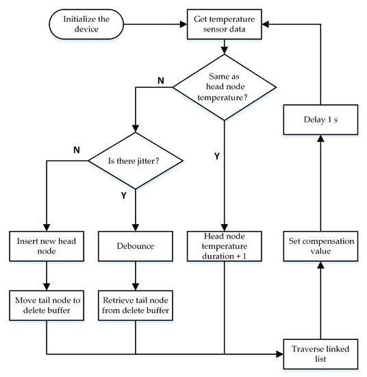 The processing steps of the TCXO are shown in Figure 11. When the TCXO is working normally, the temperature data of the temperature sensor is read once per second, and the temperature data read from the temperature sensor is then compared with the temperature data t stored in the head node of the linked list; if they are the same, the temperature duration T stored in the head node of the linked list is incremented by 1. If they are different, the sensor data is compared with the temperature data t stored in the second node of the linked list. If they are the same, it means that there is a small temperature jitter, which may be caused by the measurement error of the temperature sensor, and the small temperature jitter does not cause the crystal thermal hysteresis. Experimental measurements show that this small temperature jitter is very common. If these small temperature jitters are not addressed, the list contains useless data, making it impossible to accurately judge the hysteresis. To avoid this situation, when a small temperature jitter is observed, that is, the temperature data read by the temperature sensor is the same as the temperature data stored in the second node of the linked list, the useless recorded data should be deleted due to the small temperature jitter. When a small temperature jitter is detected, the temperature duration T of the head node is added to the temperature duration T of the second node in the list, and the head node is then deleted. As a result of deleting the head node, the length of the linked list changes. Therefore, we must establish a deletion buffer to store the tail node that was deleted. In this way, after deleting the head node, a tail node can be taken from the buffer and inserted into the tail of the list to maintain the length of the linked list. When the temperature data read by the temperature sensor is different from the temperature data stored in the head node of the linked list and there is no jitter, a new head node is inserted at the head of the linked list, and the temperature t and duration T are stored. Then, the tail node is deleted and the tail node is stored in the delete buffer.