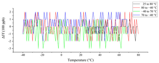 Through the digital compensation of the crystal oscillator, the impression of the crystal oscillator’s thermal hysteresis on the frequency stability of the TCXO can be more clearly observed in Figure 7. However, the conventional TCXO does not perform temperature cycle testing because, when its frequency stability is a few ppm, the thermal hysteresis error of the crystal is generally several hundred ppb, and such a small error is not obvious when it is added to a few ppm [20]. To improve the frequency stability of these TCXOs, it is more effective to improve the accuracy of thermal compensation than to compensate for hysteresis errors.