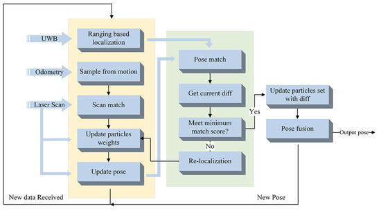As mentioned above, the UWB position has large uncertainty, which is manifested as positioning results jumping around the real value. Therefore, the fusion of PF-based poses and UWB poses is conducted, to improve the accuracy, as shown in Algorithm 3.