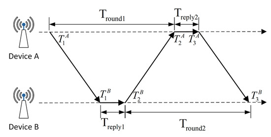 DSTW ranging method is used in the ranging-based localization method. The schematic diagram is shown in Figure 2. Two axes respectively indicate the time axis of device A and device B.
