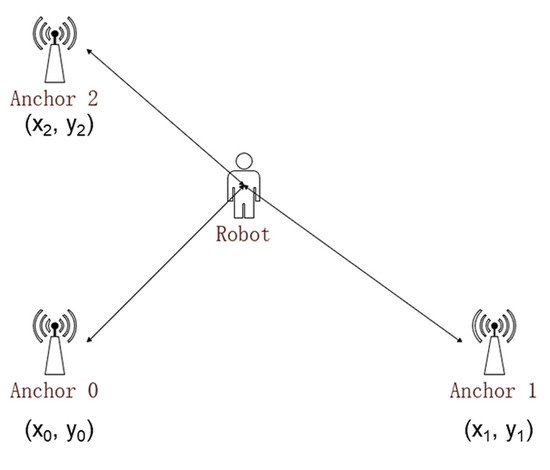 To cut down the cost of computation, is set as the original point, with set on the x-axis and set on the y-axis, and all three anchors are at the same height . In Equation (8), expresses measured distance between the tag and , and (, , ) refer to the position of .