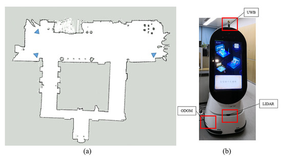 (a) The top half of the scenario is a hall of 40 by 15 m. The three triangles are poses of anchors. (b)The robot platform is equipped with odometry, lidar, and UWB.
