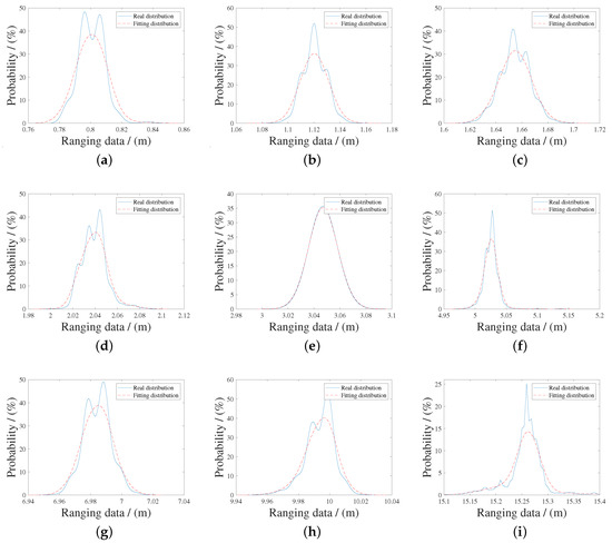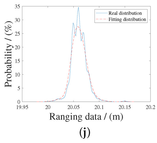 Due to the geometric relationship and the influence of terrain, the distance between the robot and a certain anchor is mostly in the range of 3 m–20 m. Therefore, we can find the relationship between and , shown in (22). Table 2 shows the results and Figure 6 shows fitting results from the distance between 3 m to 20 m. Figure 7 shows the probability distribution of this group of ranging values