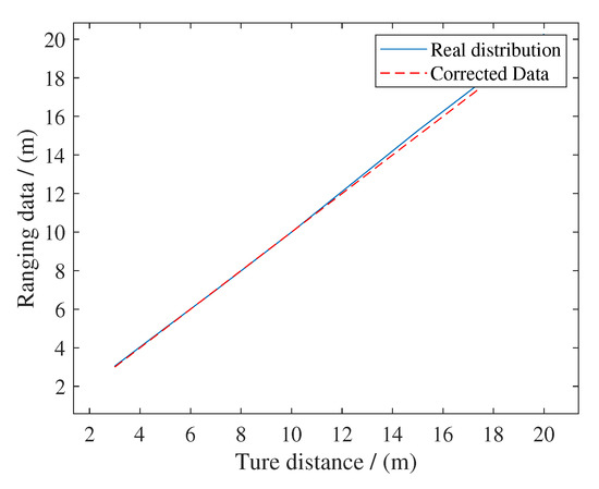 Fitting results from the distance between 3 m to 20 m. Corrected measurements show better linearity and are closer to the true value.