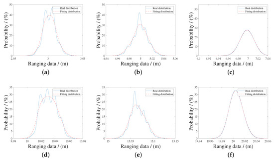 The probability of corrected ranging measurements is shown when distances are (a) 3 m, (b) 5 m, (c) 7 m, (d) 10 m, (e) 15 m, (f) 20 m. At every experiment, the probability distribution is approximately Gaussian distribution, and there is a smaller deviation between the maximum probability value and the true value, shown in Table 2.