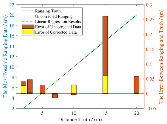 Comparison shows linear regression improves the accuracy of ranging, with error limited in 0.05 m.