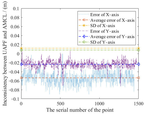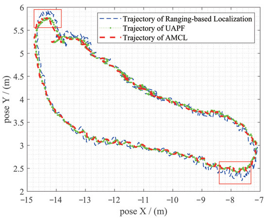Figure 13 shows the trajectories of single ranging-based localization, Adaptive Mento Carlo Localization and UAPF. The trajectory of individual ranging-based localization is more unstable while the trajectory of UAPF is closer to AMCL (as compared). The two red rectangles show that when a huge bias (about 0.2 m) of ranging-based localization exists, UAPF has the analogous performance to AMCL.