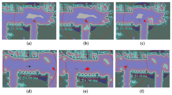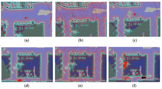 Comparison of global localization between AMCL and UAPF. (a) The initial pose of UAPF. (b) Global localization with UAPF. (c) Result of global localization using UAPF. (d) The initial pose of AMCL. (e) Global localization with AMCL. (f) Result of global localization using AMCL.