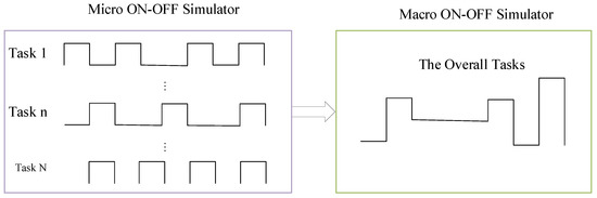 Next, referring to the above model, we utilize ON/OFF model to generate the expected data set with Pareto distribution. To achieve that, we will firstly make the following assumptions: (a) for each type vehicular computing task, its arrival and departure is usually assumed to obey Poisson distribution, and (b) multiple vehicular tasks are independent processes with their own distributions, respectively. Then, Taqqu et al.’s research results have theoretically proved that the superposition of an infinite number of independent update-return processes with heavy-tailed distributions converges weakly to the typical self-similar process fractal Brownian motion (FBM) [45]. Here, the update and return process refers to the ON/OFF process in the Packet-Train model, which has strictly alternating ON and OFF states with their, respectively, own heavy-tailed characteristics. In view of the above concepts, we can explain it from both macro and micro perspectives. From a macro-perspective, the status ON represents the available on-board resource can support the coming computation tasks, while the status OFF indicates the opposite of the status ON. From a micro-perspective, the status ON represents that vehicular tasks are continuously generated at a constant rate, while the status ON indicates that there is no new generating vehicular tasks. In Figure 2, the relationship between the macro model and the micro model is clearly demonstrated. In fact, the macro version can be regarded as an accumulated version of the micro version.