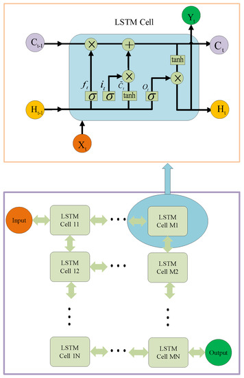 Compared with the conventional RNN framework, LSTM is more effective to extract the temporal correlation existing in the temporal sequence, which mainly benefits from the loop framework to remember the time-correlated sequence. Specifically, the standard LSTM module compromises four gate framework-based LSTM cell, by which LSTM is emdowed with the long-term memory. Specifically, the gate framework are a arrange of memory units spanning from previous slots to the current slot cascaded through a cell state, which has been shown in Figure 3. Specifically, the number of units is related to length of time sequences to be studied. For each LSTM cell, which usually embraces three gate activation functions and , paired with two output activation functions and . The framework for neural network is related to the complexity of the specific problem, which can be experienced determined with repeat tests.