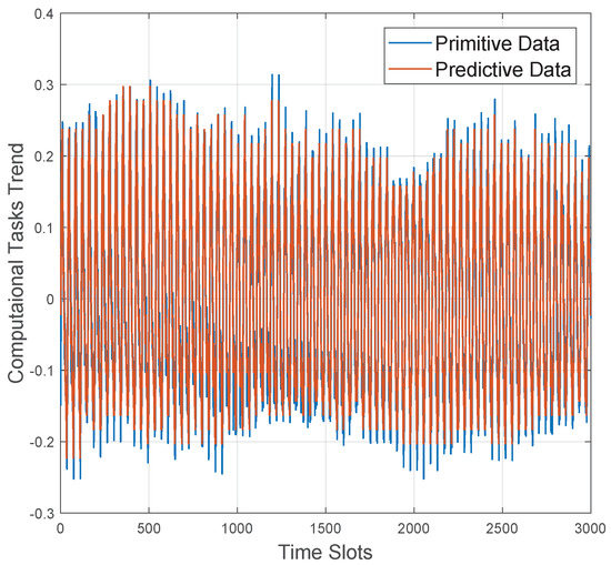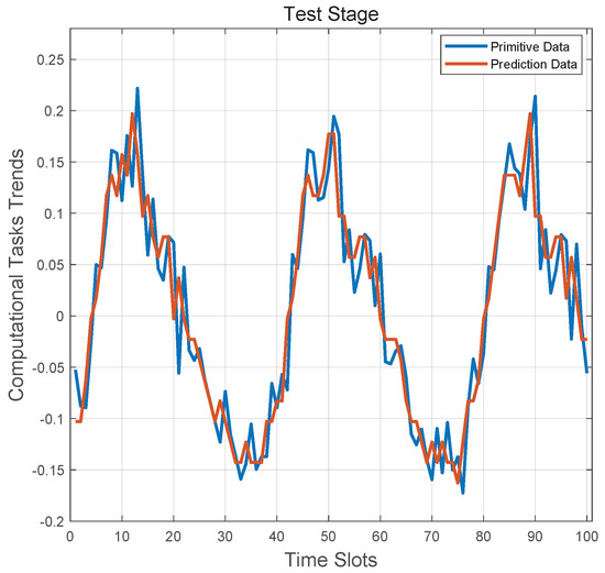 Figure 6 evaluates the LSTM-based resource discovery scheme’s performance on testing stage. It is clear that the LSTM algorithm can almost reproduce the entire vehicular tasks flow’s tendency. In order to get a more visual display, we define a criterion as the baseline of judging the resource utilization status on each service vehicle. Specifically, if one service vehicle’s prediction result is above the baseline, it is considered that the resource utilizing state is idle at next time slot; otherwise, the resource utilizing state is busy. Furthermore, the physical meaning of resource availability prediction curve is depends on the system model. The predictive curve can be discretized with different quantitative steps, and the baseline can be flexibly adjusted to represent more detailed resource utilization status. In this way, the scalability of the proposed LSTM algorithm can be significantly enhanced.