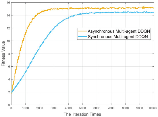 In this section, we verify the effectiveness of the proposed computation offloading management algorithm from different perspectives. During the process, a multi-agent DDQN algorithm with the centralized training and decentralized execution framework in Reference [57] is introduced as a comparative approach, which is named as Synchronous Multi-agent DDQN. In Figure 5, the convergency performance of proposed algorithm is presented with the tendency of loss value. Specifically, the convergence performance can be guaranteed within 4000 iterations. The simulation results have been presented in Figure 7, in which the convergence speed of the proposed algorithm is faster than the synchronous one. The reason is mainly from two aspects, one is the benefits from the designed asynchronous iteration sequence, and the other is the action space consisting of the neighboring service vehicles. Specifically, the asynchronous iteration sequence mechanism endows each agent a relative stable training environment, which can accelerate the convergence speed to the optimal solution. In terms of the reshaped action space, it can provide an action space with a smaller size. A smaller size solution space can definitely cause a faster convergence speed.