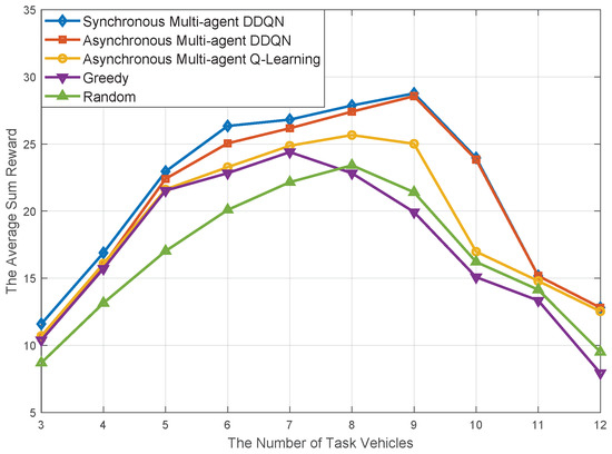 In Figure 8, to evaluate the performance of the average overall reward, in addition to the Synchronous Multi-agent DDQN algorithm, we also compare our proposed algorithm with Asynchronous Multi-agent Q-learning, greedy algorithm (Greedy), random algorithm (RANDOM). It is apparent that, except the Synchronous Multi-agent DDQN algorithm, the proposed algorithm’s performance is better than the designed comparative schemes. In fact, owing to the global solution space consisting of all service vehicles, the Synchronous Multi-agent DDQN can obtain a better solution than our proposed algorithm. However, this very limited performance advantage is at the expense of expensive computational complexity, which will be analyzed in detail at the final of this section. From the macro perspective, the overall performance gap between our proposed algorithm algorithm and other comparative algorithms, shows a trend of increasing first and then decreasing. The performance is due to the fact that, with the increase of task vehicles, the resting resource availability provided by service vehicles gradually reduces. During the process, the dimensionality of solution space reduces in a gradual way, and the performance gap between our proposed algorithm and RANDOM get smaller gradually.