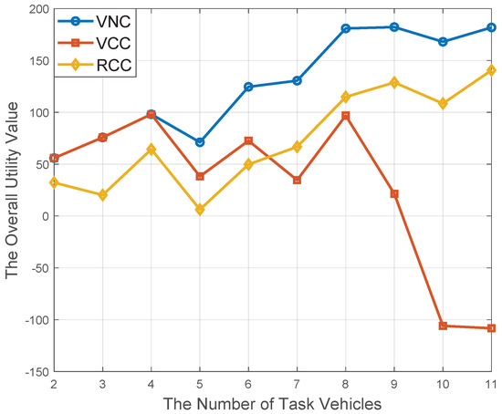 In Figure 9, the performance of the proposed computation offloading scheme (CVN) is simulated, which joins VCC and RCC together. The computation offloading schemes enabled by VCC and RCC are utilized as the comparative schemes. It is apparent that CVN scheme can achieve better performance than both VCC and RCC schemes. At the beginning, there are less task vehicles in the model and the service vehicles’ on-board computation resource is sufficient to accommodate the task vehicles’ resource requirements. In this way, CVN scheme and VCC scheme can achieve the same performance. With the increase of task vehicles, the resource availability of service vehicles cannot satisfy their resource requirements any longer. As a result, CVN scheme demonstrate a better performance than the VCC scheme. Due to the expensive price of computation resource provided by RSUs, the performance of RCC scheme is always inferior to CVN scheme.