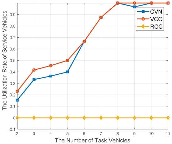 With the identical simulation environment with Figure 9, the resource utilization of service vehicles is shown in Figure 10. In particular, the resource utilization [36] can be defined as the ratio of the allocated resource to the overall on-board resource availability. From Figure 10, it is obvious that VCC scheme can achieve better performance than CVN and RCC algorithm. It is obvious that there is no other available computational resource except the underutilized on-board resource in the VCC scheme. In this way, the VCC scheme’s utilization rate is the highest one than the other schemes. In contrast, for the RCC scheme, all the computation tasks are offloaded to resource-rich RSUs, and service vehicles’ underutilized on-board resource are not utilized at all; thereby, its utilization rate is the lowest one.
