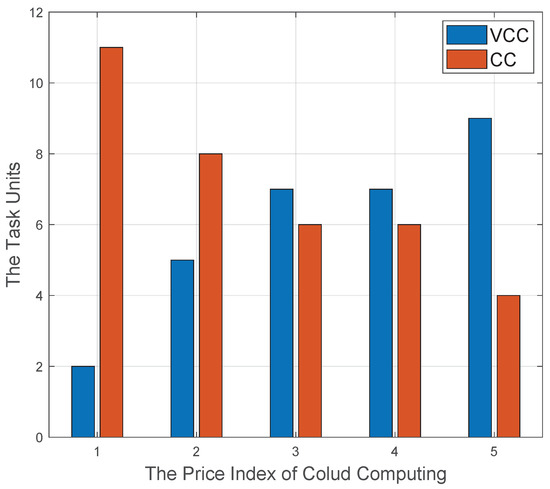 Under a total 13 computation tasks, Figure 11 presents the impact of the pricing strategy on the computation offloading management scheme. Specifically, the computation tasks allocated to service vehicles’ on-board resource or cloud computing center are defined as VCC and CC, respectively. The price index of cloud computing corresponds to a set of gradually increasing unit price. It is apparent that, with the increase of unit price of RCC, the resource utilization from RCC decreases gradually. It is natural that task vehicles tend to choose cheaper on-board computation resource. In other words, if the pricing strategy of RCC is reasonable, the RCC-based computation offloading will be welcomed by task vehicles.
