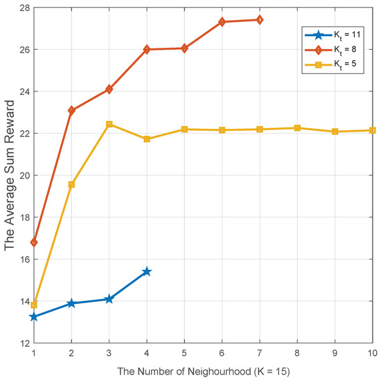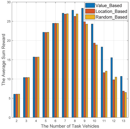 In Figure 13, the impact of the number of neighbor agents on system performance is evaluated. In a CVN with 15 vehicles in total, three sizes of neighboring services vehicles: large (11), intermediate (8), and small (5), are simulated, respectively. Moreover, in addition to service vehicles, all other vehicles are task vehicles. Based on the certain service vehicles, the size of neighbor agents gradually changes from 1 to 10. It is apparent that the three cases’ overall tendency are gradually rising. In fact, the larger neighborhood space can achieve better environmental information and more available resource options. From a macro perspective, the intermediate scheme can achieve the best performance compared to the other schemes. Specifically, the intermediate size can achieve a relative balance between resource supply and demand. However, for the small size, the available resource is much more than task vehicles, and only a small part of resource availability can be utilized. In terms of the large size, the task vehicles’ resource requirements cannot be satisfied by the limited on-board resource availability provided by service vehicles. Generally speaking, although a bigger neighbor agents’ size can obtain a better performance, a bigger size heralds a greater computation complexity. Above all, under the limited computation capability, a reasonable neighbor agents’ size is very important to obtain a better performance.