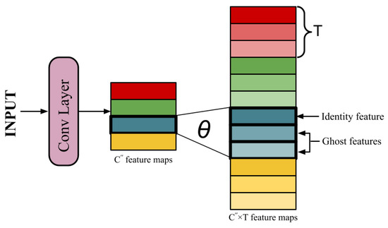 - The reduction of parameters leads to the loss of significant information. To make up for the remaining features, new feature maps are derived from each of the existing features by performing T low-cost operations (Ghost transformations) on them. These derived features are called Ghost features. This equation can be represented aswhere is the ith feature map in and is the jth linear operation deriving a Ghost feature from . Thus, and . Among the T Ghost transformations applied on , one operation is kept as identity operation to retain the original feature map. The remaining operations generates the ghost features. Thus, now a total of features are generated, such that .