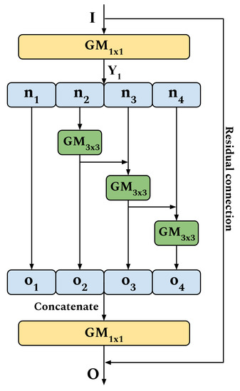 Figure 2 shows the diagram of a single GhoMR module, which is the proposed backbone for HSI classification. A GhoMR uses multiple internal GMs to extract features in a residual hierarchical fashion. This strategy is inspired by Res2Net [64] and is useful for extracting complex details from the HSI cube. Let the input for an arbitrary GhoMR module be , where W, H, and C are the width, height, and channels respectively. Feature extraction from this cube is done in three steps: