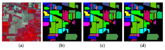 - Indian Pines (IP)—The images in this dataset were collected in 1992, over the Indian Pines test site in north-western Indiana using the AVIRIS [67] sensor. The HSI cube has a spatial dimension of pixels with 224 spectral bands in the wavelength range of 400 to 2500 nm, among which 24 bands corresponding to regions of water absorption were eliminated. Among the pixels, are annotated with ground truth from a set of 16 different vegetation classes.