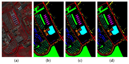 Classification maps for UP (a) False color image (b) Ground-Truth (c,d) Predicted maps for and training data, respectively.
