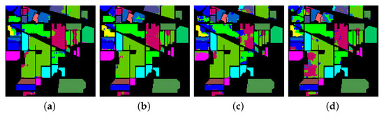 Predicted classification maps for IP with and input spatial size for (a,b) training data and (c,d) training data, respectively.