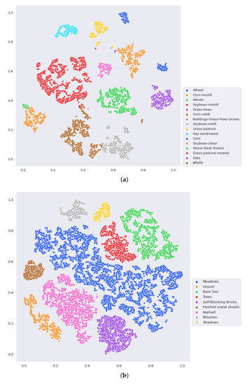 Hyperspectral images (HSIs) are image cubes where each pixel is measured as one near-continuous spectrum. Unlike RGB images, HSIs have hundreds of spectral bands, containing knowledge regarding wavelengths beyond the visible spectrum. These cubes contain both spatial and spectral information, which can be widely utilized in remote sensing for analyzing a scene of interest. Hyperspectral imaging also finds its applications in agriculture [1], forestry [2,3], archaeology [4], medical analysis [5], food quality control [6], military defense [7], forensics [8], and several other domains as well. Thus, research in HSI processing and analysis is growing rapidly, and several studies have been published in past years for the same. Often, the high spectral dimensionality of an HSI poses a challenge in the analysis due to noise and high computation costs. Earlier, algorithms like independent component analysis (ICA) [9], principal component analysis (PCA) [10], and linear discriminant analysis (LDA) [11] were used to deal with this. Recently, more advanced dimension reduction techniques [12,13,14] and band selection methods [15,16,17] have been found to address the same. An HSI is also subject to mixed pixels, i.e., a pixel can contain mixtures of spectra from different components (also called endmembers). This occurs either due to the low spatial resolution of the sensors or due to multiple scattering and intimate mixing effects. Thus, spectral unmixing is done, which involves retrieving all or some of the endmembers and estimating their fractional abundances in each of the mixed pixels. In recent years, several techniques [18,19,20] have been proposed, which have shown satisfactory results in hyperspectral unmixing. Similarly, HSI classification is another widely-concerned task in hyperspectral imaging, which this manuscript addresses. HSI classification is the process of assigning a class for every pixel in an image, based on its spectral and spatial features. Early researches on HSI classification mostly focused on utilizing shallow hand-crafted techniques [21,22]. Some of these techniques [23] utilize local covariance matrix representation to extract the correlation between the spectral bands, which are then used by machine learning algorithms, like support vector machine (SVM) [24] for HSI classification. Along with spectral methods, spatial feature extraction techniques like mathematical morphological transformations [25] and composite kernel learning [26,27] are also used. 3D wavelets [28] and 3D Gabor filters [29] are also efficient methods for extracting spatial features from HSIs. Other techniques [30,31,32] involving sparse representations are also developed to exploit the spatial contextual knowledge in HSIs.