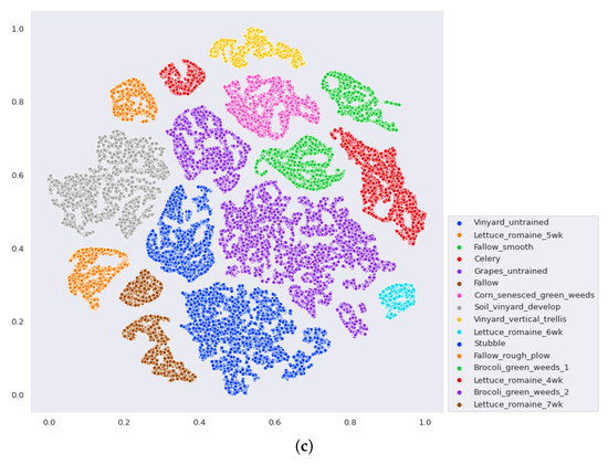 Visualization of extracted features via t-SNE where the 2D coordinates denotes the samples and the different colors represent different classes for the (a) IP, (b) UP, and (c) SA dataset.