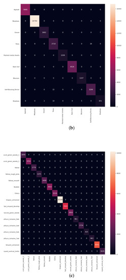 Confusion matrices obtained on test samples for the (a) IP, (b) UP, and (c) SA dataset.