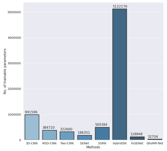 Finally, a set of visualizations are performed to demonstrate the discriminative power of GhoMR-Net. The higher-dimensional features from the GAP layer of the network are extracted for each sample in the test set and are reduced to two-dimensional coordinates via t-SNE. These coordinates are plotted and shown in Figure 8 for the three datasets. It is clearly observed, that the features representing pixels having the same ground-truths form nearby clusters, which are represented by similar colors. Moreover, the confusion matrices are obtained on test data and are given in Figure 9. Furthermore, the total number of trainable parameters is compared with seven above-mentioned architectures-3D-CNN [52], M3D-CNN [56], Two-CNN [55], HybridSN [59], SENet [63], FuSENet [63], and SSRN [58]. As shown in Figure 10, the proposed network has only 32,704 trainable parameters, which is much lesser than HybridSN, SSRN, and FuSENet having 5,122,176, 500,384, and 128,848 parameters, respectively.