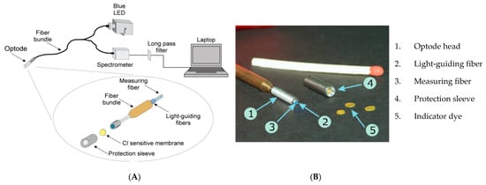 (A) Schematic representation of optical fiber based Cl− sensor measurement setup, (B) components of the sensor [].
