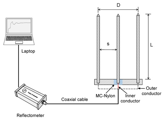 Generally, two-rod TDR probes have larger sample areas compared to that of three-rod ones having the same rod spacing (s) and rod diameters (d). In this study, a three-rod probe was selected for the HETDR system in order to avoid the need for an impedance-matching transformer. Usually, three-rod probes provide simpler waveforms and more distinct reflections compared to those of two-rod probes [30]. Figure 1 shows the three rods of the probe selected for the HETDR system, each having a diameter of 0.6 cm. These rods, made of stainless steel, were mounted on a cuboid head with a length of 16.5 cm, a height of 2 cm, and a depth of 1.5 cm by fastening a screw at the end of each rod. An insulation cap of mono cast nylon was placed between a center electrode and the cuboid head. The center electrode and two outer electrodes were connected to the inner and outer conductors of a 50-Ω coaxial cable, respectively. Three different probe lengths (ranging from 50 to 100 cm) were used in this study; moreover, the spacing of the electrodes on each cuboid head was adjustable (Table 1). The ratio between the diameter and the spacing of the rods (d/s) ranged from 0.08 to 0.24. Knight [31] suggested that this ratio should be greater than 0.1 to ensure a reduction of the skin effect (the tendency of the total energy per unit length to be concentrated within a cylindrical region). In contrast, Petersen et al. [32] reported that the volumetric water content can be appropriately determined with a configuration as small as d/s of 0.02. The TDR unit (HL1101, Hyperlabs) was used to generate a step pulse with an input voltage of 250 mV and to record the reflected signals. Overall, 25 signals were stacked to increase the signal-to-noise ratio.