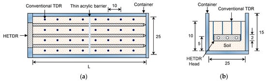 HETDR probe with a container: (a) plan view; (b) side view. All values are expressed in cm. TDR: time domain reflectometry.
