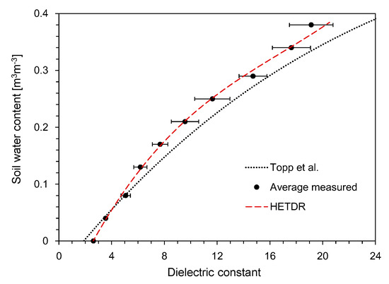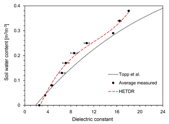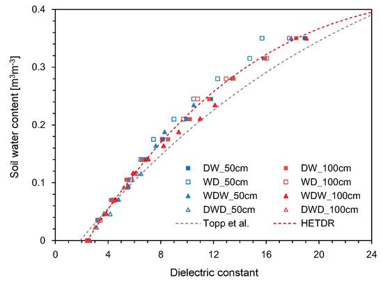 where θ is the average volumetric water content of the soils. All data plotted in Figure 15 include the results obtained by using probes with lengths of 50 and 100 cm, but the probe length should not affect the accuracy of water content determination for non-conducting media [30]. Compared to the empirical relationship suggested by Topp et al. [12], the dielectric constants determined in this study through the HETDR system for SWC > 0.04 m3 m−3 were slightly smaller.