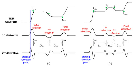 Typical TDR waveforms and the variation of first and second order derivatives in: (a) two segments (DW); (b) three segments (WDW).