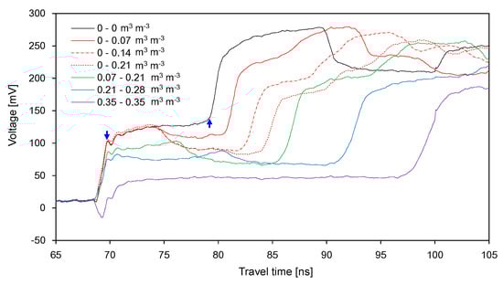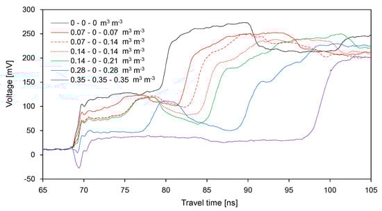 The waveforms recorded in the soil container divided into two segments are plotted in Figure 7 and Figure 8. Figure 7 shows the waveforms obtained from the dry-wet treatment (DW). Under dry conditions, the signal amplitude rapidly increased from the starting point and then converged to a certain value up to the end reflection point. However, an additional reflection occurred under partially wet conditions. The signal amplitudes before the first reflection under the first three partially wet conditions were same under dry conditions: The soils in the first segment remained dry. The average amplitude for Δt22 decreased with the increase in SWC in the second segment; moreover, Δt22 increased with the increase in SWC in the second segment. As the SWC increased in the first segment, the average amplitude for Δt21 decreased, whereas Δt21 increased. Considering that the electrical conductivity of the soil can be represented by the signal amplitudes [33], the variation in the average amplitude for each duration depends on the electrical conductivity of the soil. As the SWCs in the two segments were closer together, the difference between the average amplitudes for Δt21 and Δt22 decreased. Overall, the total travel time, which is the sum of Δt21 and Δt21, increased with the average SWC in the container.
