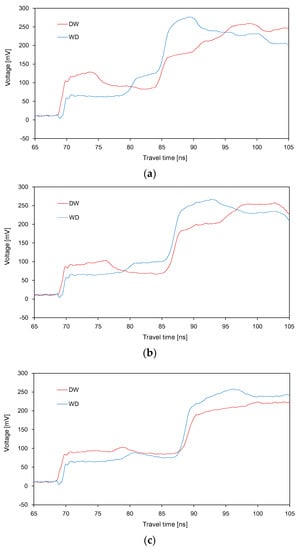 The waveforms obtained for three different average SWC values (0.105, 0.14 and 0.175 m3 m−3) through the DW and WD treatments are plotted in Figure 9. For each average SWC value, the waveforms obtained from the two segments in a different sequence were compared. When the difference in SWC between the two segments was significant, the difference in the average amplitudes for Δt21 and Δt22 between the DW and WD treatments was also significant (Figure 9a). Moreover, Figure 9b,c show that, as the difference in SWC between the two segments decreased, the difference in the average amplitudes for Δt21 and Δt22 between the DW and WD treatments also decreased. For the same average SWC, the values of total travel time obtained from the DW and WD treatments were similar, regardless of the different sequences.