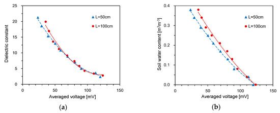 The electrical conductivity of soils has been determined from the signal amplitude of the TDR waveform [19,33,34,35,36,37]. A number of studies represented that the electrical conductivity of soil pore water is related to the water content values and the electrical conductivities of soils [38,39,40,41,42]. Assuming that the electrical conductivity of soil pore water remains constant, the electrical conductivity of soils can be related with the SWC. In this study, the average amplitude for each duration was used to estimate the SWC in each segment. First, the average amplitude and the dielectric constants determined from the TDR waveforms in the homogeneous soils with 10 different water content values are plotted in Figure 12a. For both probe lengths, the dielectric constant decreased with an increase in the average amplitude along a quadratic polynomial function. Figure 12b shows the relationships between the measured SWC and the average amplitude. The SWC decreased with an increase in the average amplitude along the quadratic polynomial function.
