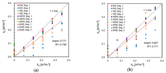 Comparison of SWCs measured and estimated with the probe lengths of: (a) 50 cm; (b) 100 cm. θm and θe denote the SWCs measured and estimated from HETDR, respectively.