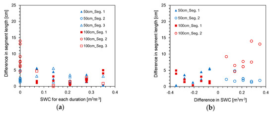 Difference between actual segment length and segment length estimated for each duration in the WDW treatment along; (a) SWC; (b) difference in SWC.