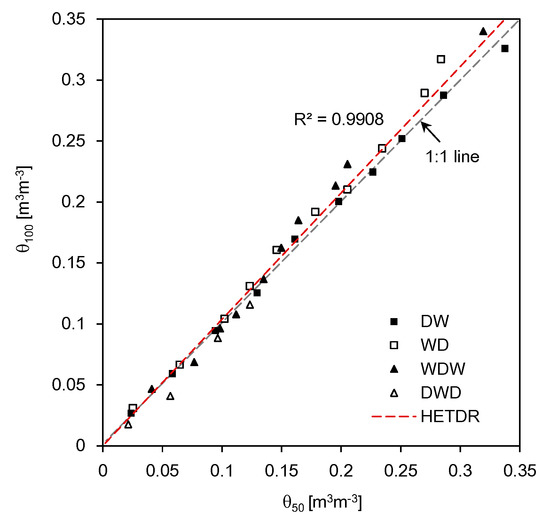 Relationship between the SWCs estimated using probes with lengths of 50 cm and 100 cm. θ50 and θ100 denote the SWCs estimated from the probes with lengths of 50 cm and 100 cm, respectively.